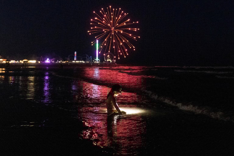 在美國德州的加爾維斯頓(Galveston)附近的沙灘上,今年 5歲的布里查德(RayLynn Blizzard)戴著頭燈,在歡慶「六月節」(Juneteenth)的煙火下自在地玩著。