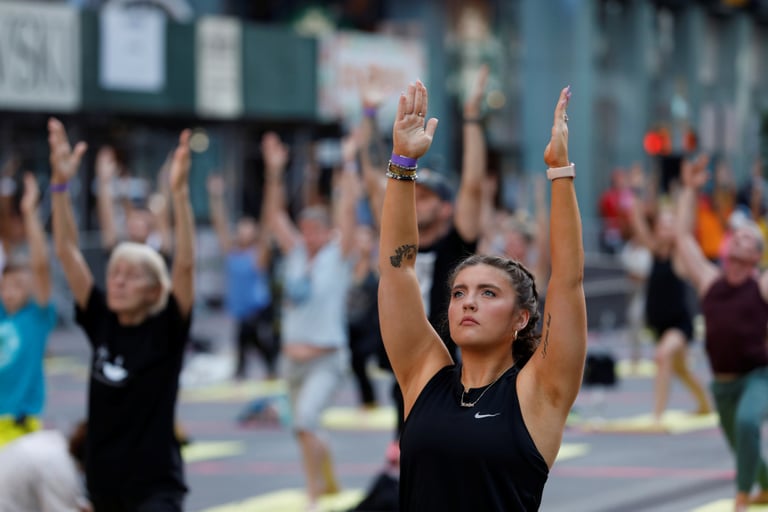 在美國紐約,為了慶祝夏至的到來,許多民眾紛紛來到時代廣場,參加一場名為「夏至時代廣場:讓大腦戰勝瘋狂」(Solstice in Times Square: Mind Over Madness Yoga)的瑜伽活動。