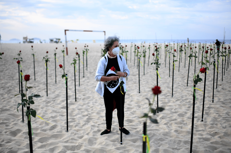 在巴西里約熱內盧科帕卡瓦納海灘(Copacabana beach),一名女子站在巴西非政府組織「里約熱內盧的和平」(Rio de Paz NGO)插下的一朵朵紅花中間,哀悼巴西 50萬名染上COVID-19病逝的病患。