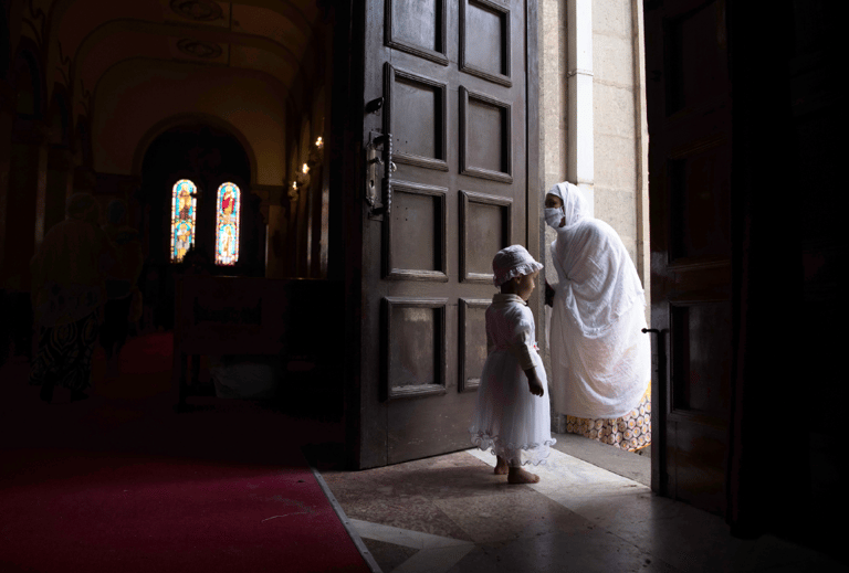 在衣索比亞首都阿迪斯阿貝巴(Addis Ababa)的聖三一大教堂(Holy Trinity Cathedral),東正教的信徒們正準備走入教堂。