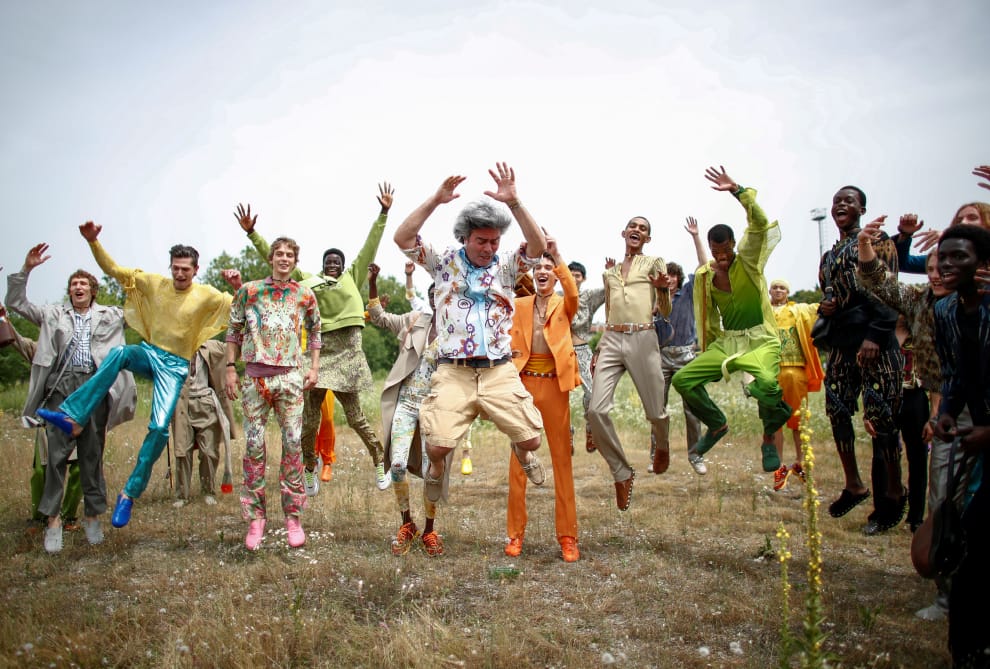在義大利米蘭的米蘭時裝周活動上,時裝設計師艾特羅(Kean Etro,中間穿卡其色短褲者)和身後一群穿著Etro牌 2022年春夏季男裝的模特兒開心地從地上一躍而起。