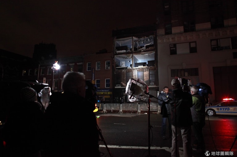 記者要不畏風雨的連線報導災情,非常的盡責勇敢!照片中的電視台,正在轉播紐約市區內一處因風雨倒塌的公寓災情。圖片來源:Allison Joyce/Getty Images