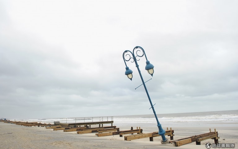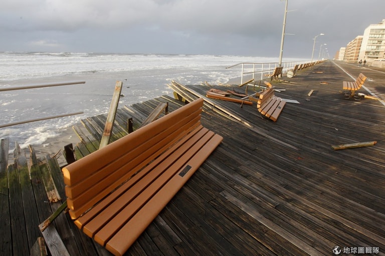 海岸旁原本充滿觀光客的徒步區,只剩下吹斷的長凳。圖片來源:Mike Stobe/Getty Images