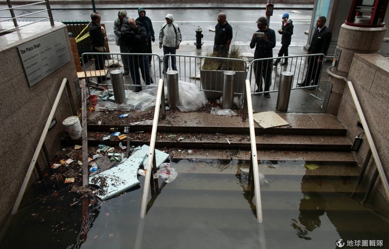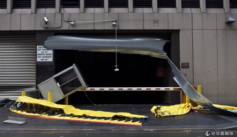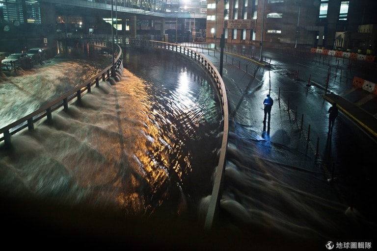 紐約市中心內的商業街,全淹沒在暗夜大水中。圖片來源:Andrew Burton/Getty Images