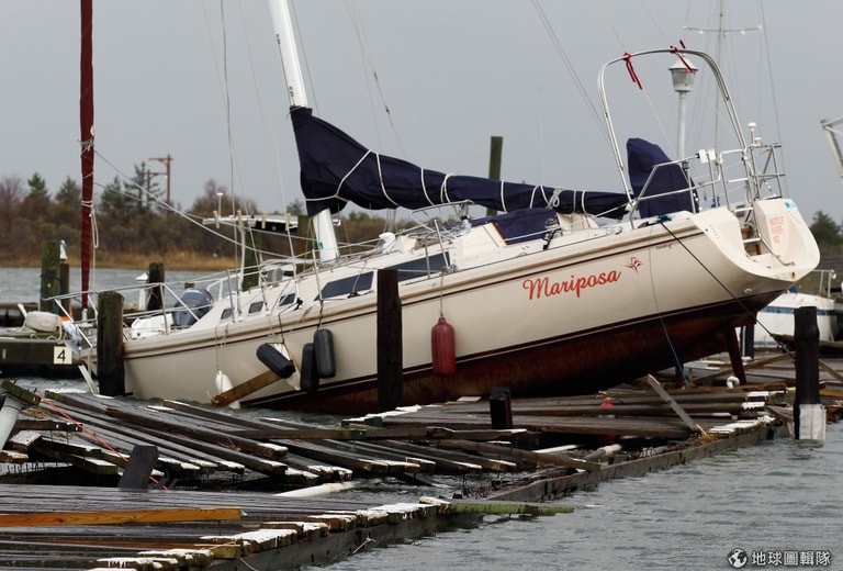 紐約長灘區(Long Beach)的海岸,原本美麗的碼頭現在卻是充滿了斷掉的木板和輩燕上岸的遊艇。圖片來源:Mike Stobe/Getty Images