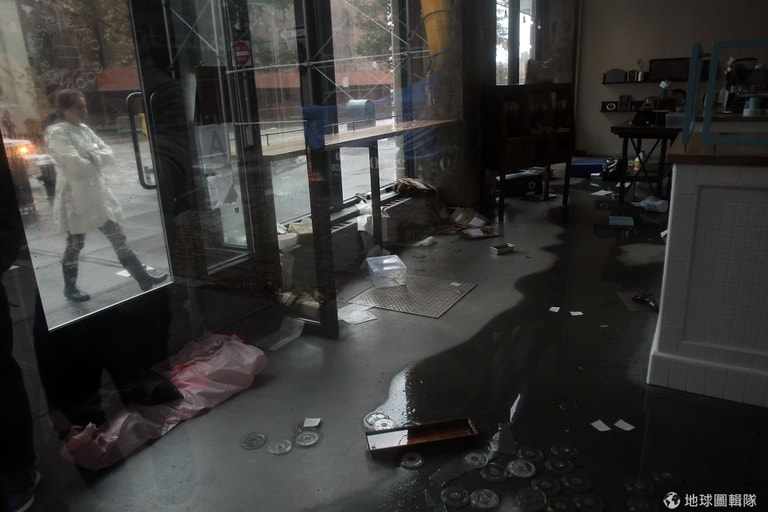 紐約布魯克林區中的一家咖啡店,店內的物品都被大水淹到四散,裝潢也都泡水。圖片來源:Spencer Platt/Getty Images