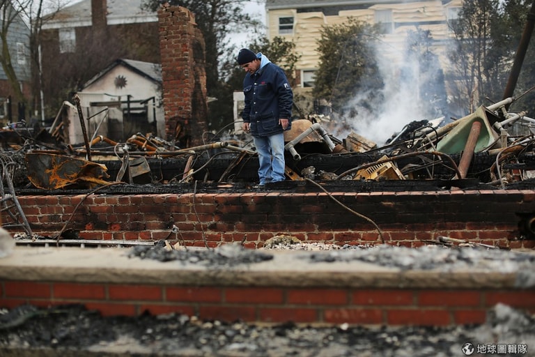 布魯克林區的大火燒毀許多房子,男子只能無言地看著因為大火而只剩下斷垣殘壁的家園。圖片來源:Spencer Platt/Getty Images
