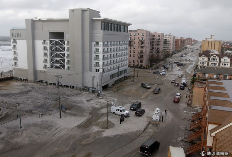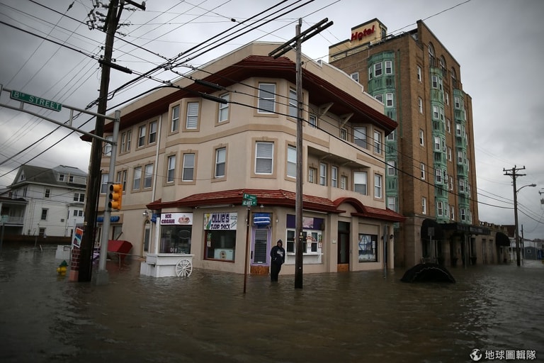 雖然颶風的風雨漸漸平息了,但紐澤西大洋城的建築仍泡在大水中。圖片來源:Mark Wilson/Getty Images