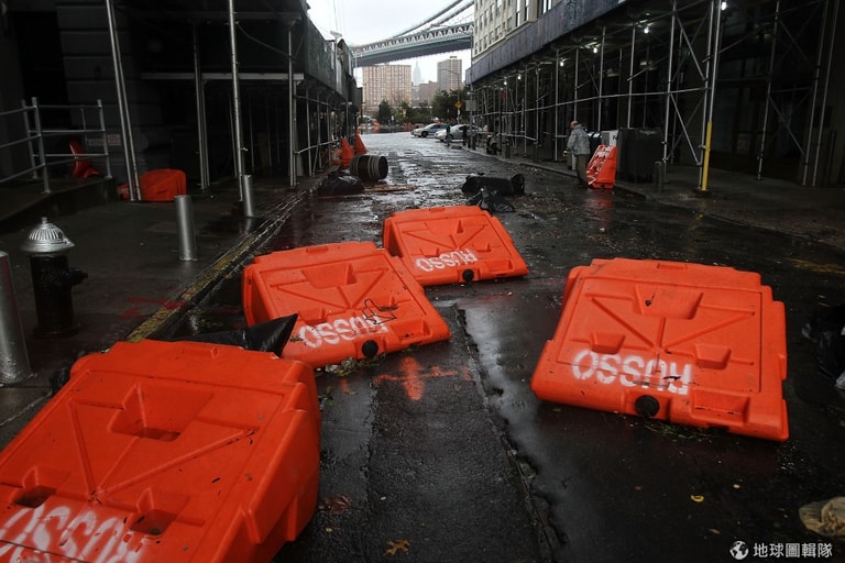 原本用來阻擋行人避開施工道路的路擋,全都被淹到大街上。圖片來源:Spencer Platt/Getty Images