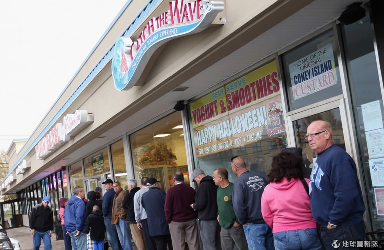 紐約市內的居民正在一家貝果店前排隊,颶風的影響讓許多店家無法正常營業,許多民眾只能餓著肚子在風雨中找尋仍然可以營業的餐廳店面。圖片來源:Bruce Bennett/Getty Images