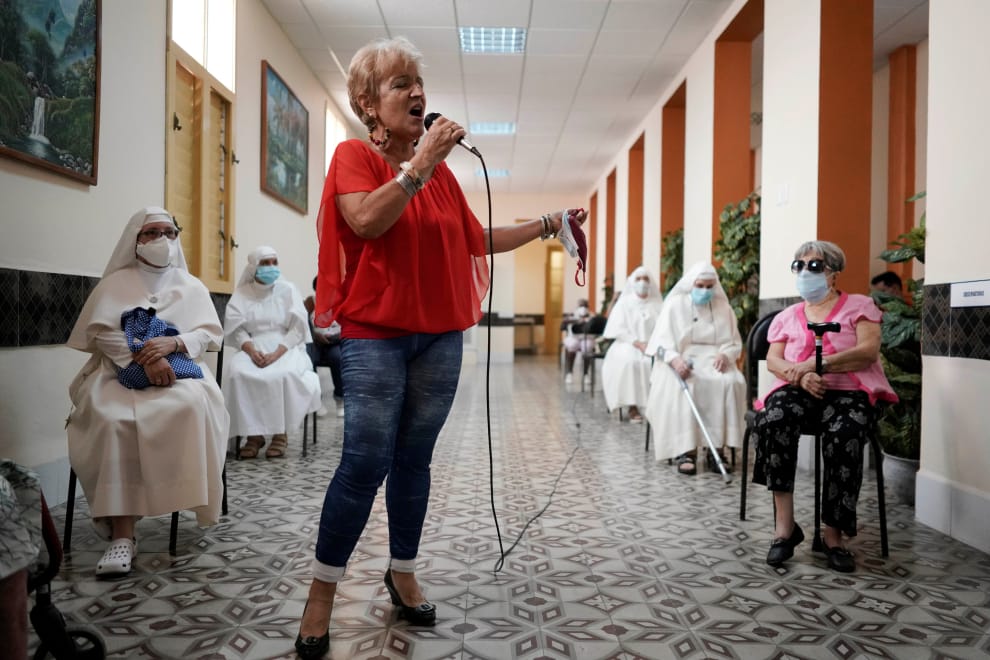 在古巴首都哈瓦那,一名女歌手在一間COVID-19疫苗接種中心裡引吭高歌。