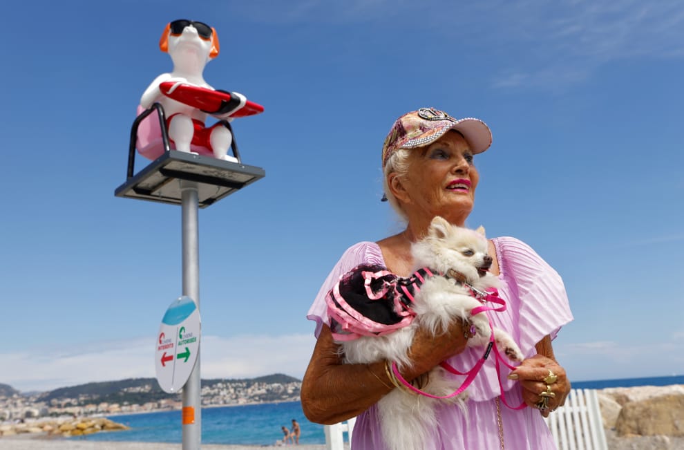 在法國尼斯市(Nice)的盎格魯街(Promenade des Anglais)海濱,一名女子抱著狗狗,出席當地一場狗狗專屬沙灘的啟用典禮。