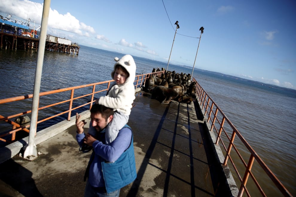 在智利中部的托梅市(Tome),一名男子揹著小孩,在一大群為了躲避虎鯨(Orcinus orca)襲擊而躲上碼頭的海獅附近拍照。
