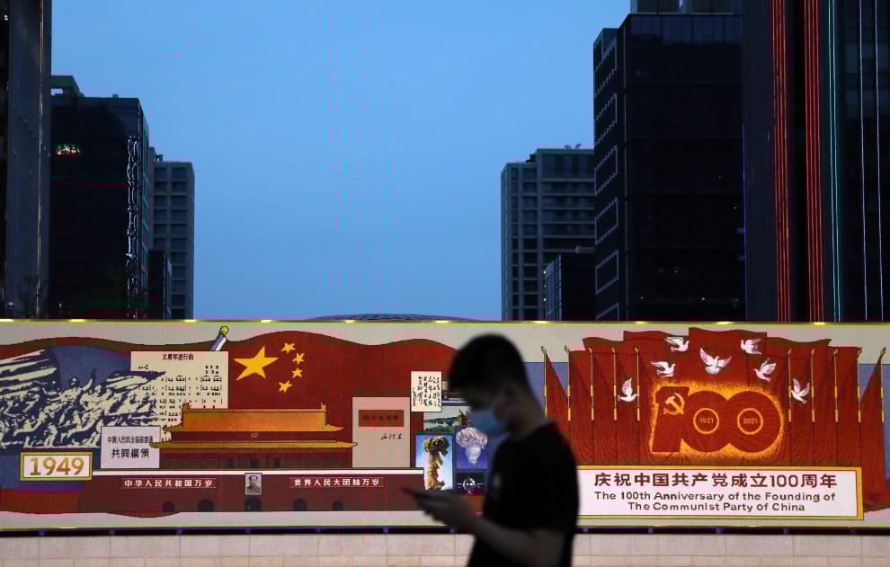 在中國首都北京的一個科技園區,一名男子經過一幅慶祝中國共產黨建黨 100周年的寬幅圖像,上頭畫著中國國旗和北京的著名地標天安門廣場。