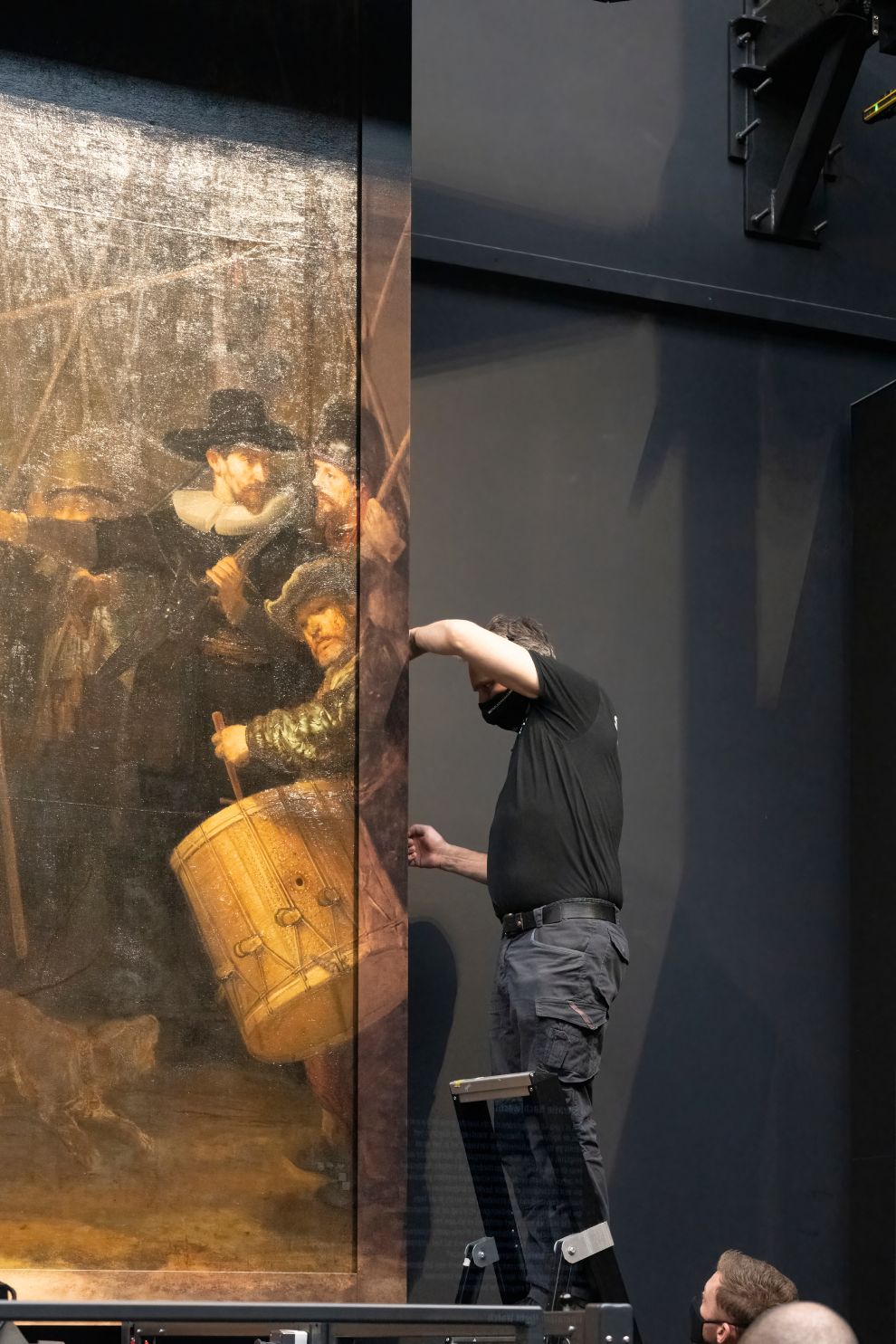 經過了數百年,人們總算有機會一睹《夜巡》完整的面貌。圖為荷蘭國家博物館的員工,正在將AI創作的《夜巡》佚失部件拼回原作旁邊。