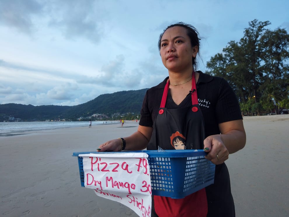 在過往遊人如織的普吉島(Phuket),今年 39歲的單親媽媽米琪(Pimonta "Micky" Suksaen)來到海灘上叫賣,她開的餐廳因為COVID-19疫情的關係,生意一落千丈,現在唯有希望政府大力推行的「普吉沙盒」觀光計畫能成功,讓當地觀光業可以重返榮景。