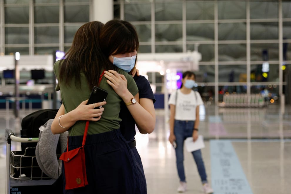 在香港國際機場,一名女子緊緊擁抱她的朋友,目送她飛往英國展開新人生。