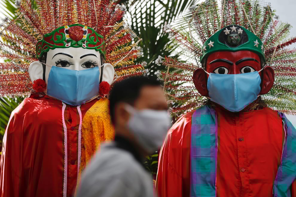 在雅加達,一名戴著口罩的男子走過了同樣戴著口罩的「Ondel-ondel」人偶。「Ondel-ondel」人偶是印尼傳統文化的一環,通常倆倆出現,負責炒熱節慶的氣氛或是作為迎賓之用。