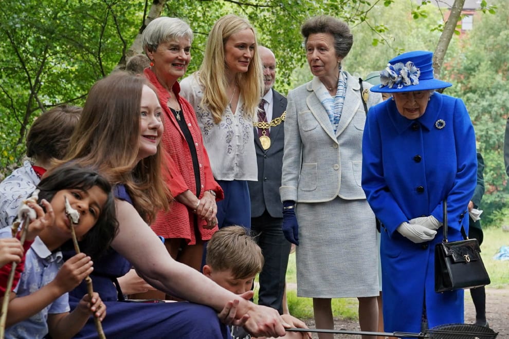 在蘇格蘭第一大城格拉斯哥(Glasgow),英國女王伊莉莎白二世(Queen Elizabeth II,右一)和安妮長公主(Princess Anne,右二)一起參與當地社區的BBQ行程。