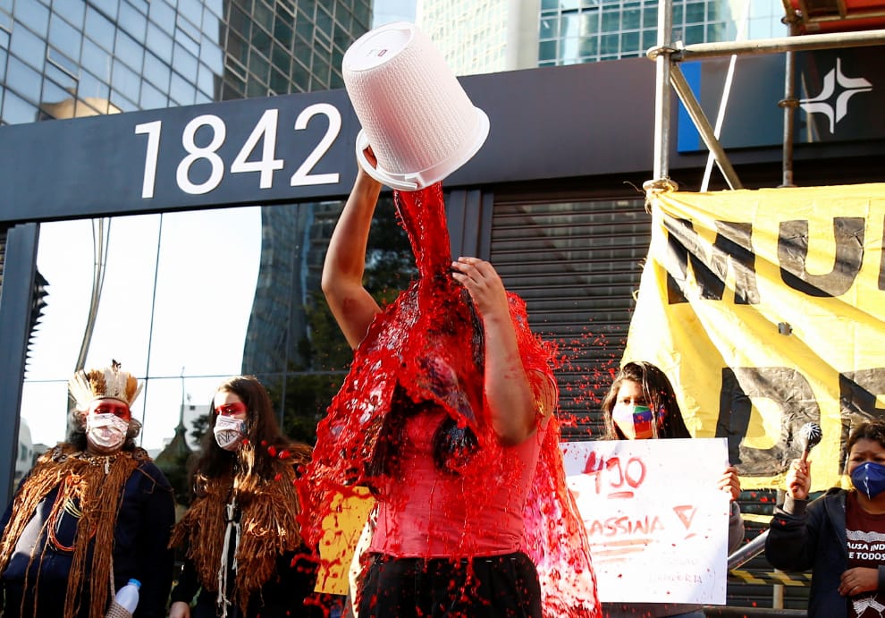 在南半球最大的城市聖保羅(Sao Paulo),一名原民女子當頭淋下象徵「鮮血」的紅水,抗議政府提出的土地改革方案「PL 490」。