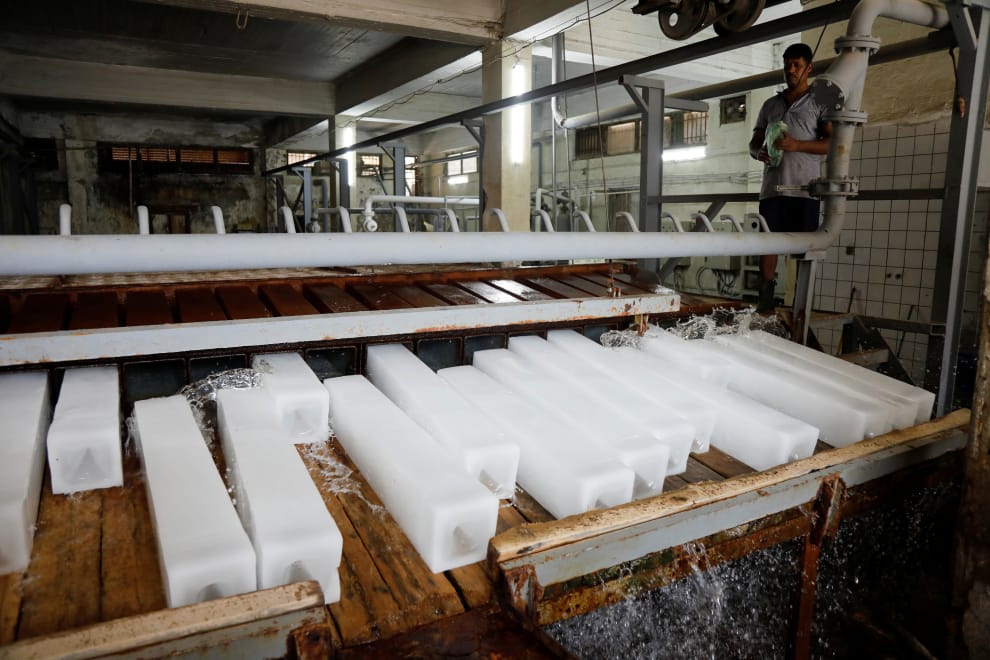 在巴格達一處冰磚工廠內,一名工作人員正在準備要放上市場賣的冰磚。