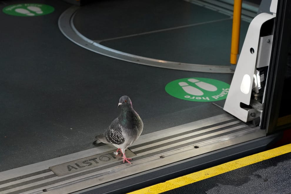 首圖故事:一隻鴿子大搖大擺地走下地鐵車廂,一旁還有保持社交距離的綠色標記......