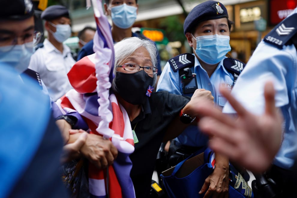 7月1日同時也是香港回歸中國的 24周年。在銅鑼灣,因為香港警方拒絕核可抗議活動的進行,一名臉戴英國國旗口罩、手持大面英國國旗的民主派抗議者在不敵警力的情形下,最後被數名警察一起架離現場。