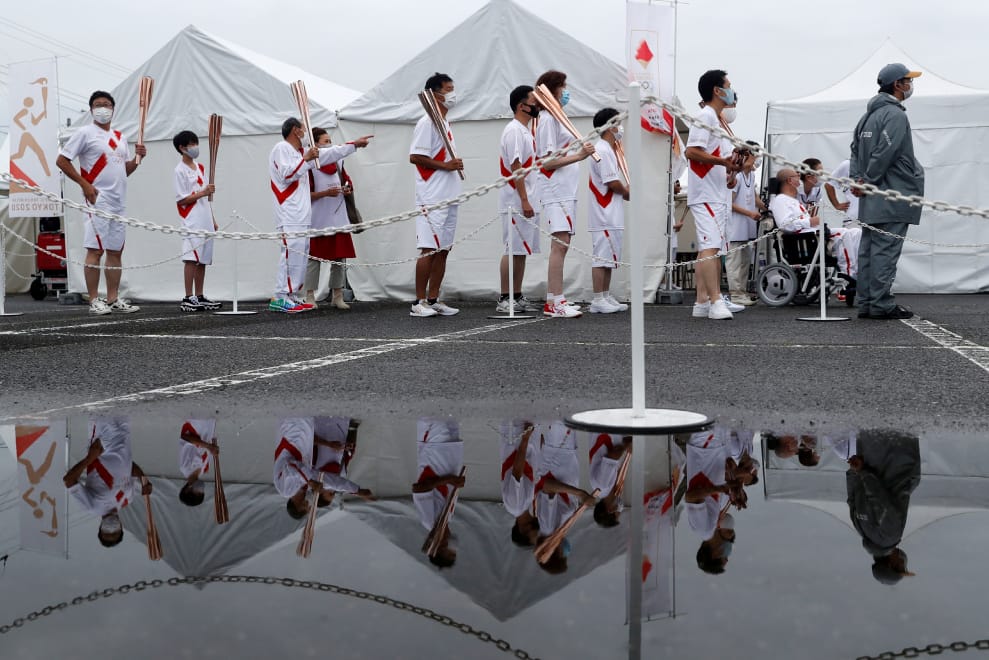 在千葉縣山武市的蓮沼海濱公園,奧運火炬手們正在排隊,等著傳遞聖火。因為當地COVID-19疫情不斷加重的緣故,日本政府取消了部分的公路聖火傳遞活動,改成在封閉的空間進行,以避免感染問題再度擴大。