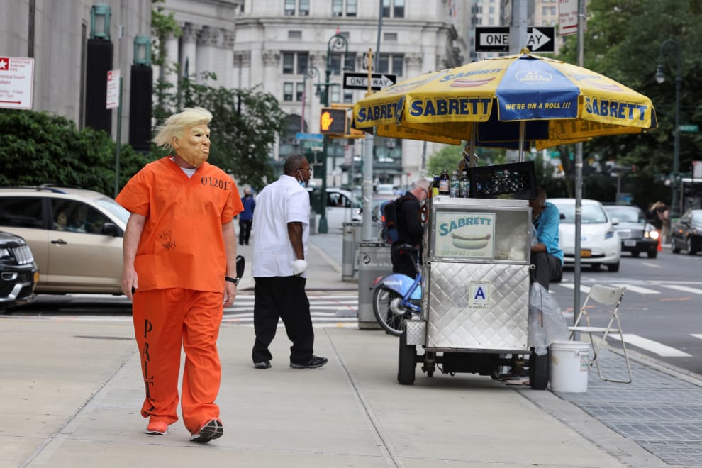 在紐約曼哈頓(Manhattan),一名男子不僅身穿囚衣,臉上還戴著美國前總統川普(Donald Trump)的面具,悠哉地自刑事法庭外頭的街道走過。