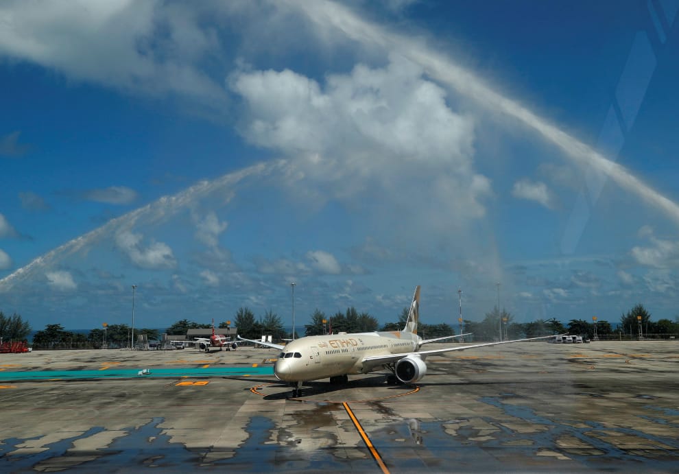 本照攝於普吉島的機場,飛機上載著第一批抵達的外國旅客,天空兩側出現的水柱,則是特別由消防車發射、用於歡迎他們的水門禮(water salute)。