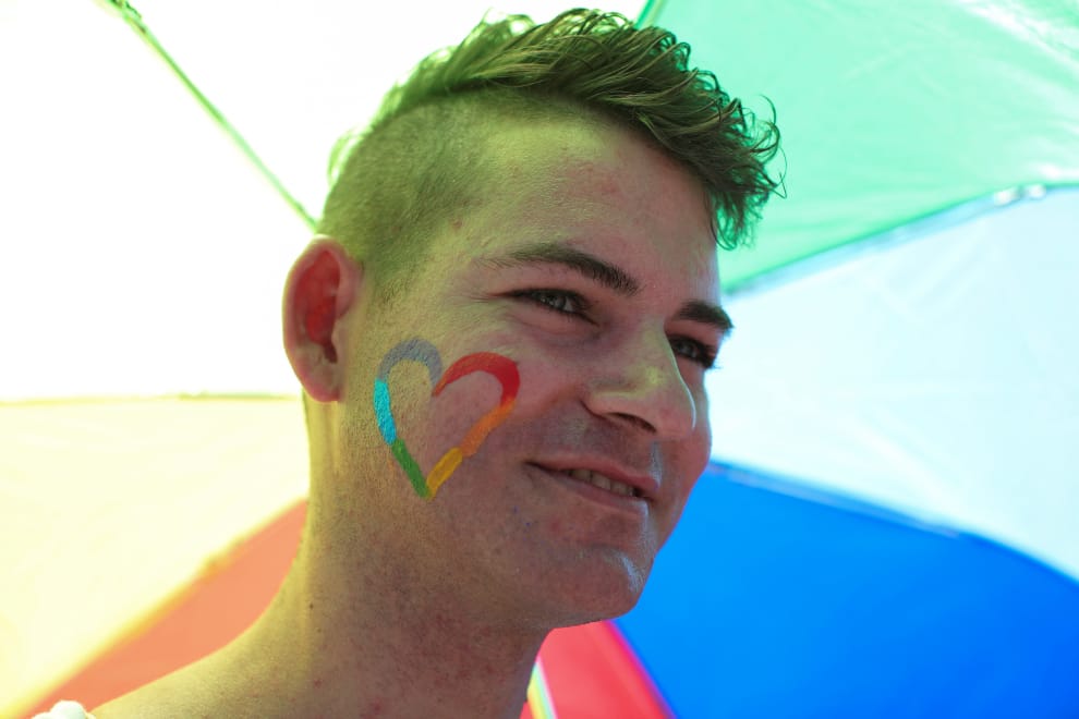 在首都普里斯提納(Pristina),一年一度的同志大遊行正熱鬧進行中。畫面內的男子為活動現場的一份子,他在臉頰畫上了六色的彩虹愛心、手上還撐著明豔的彩虹雨傘。