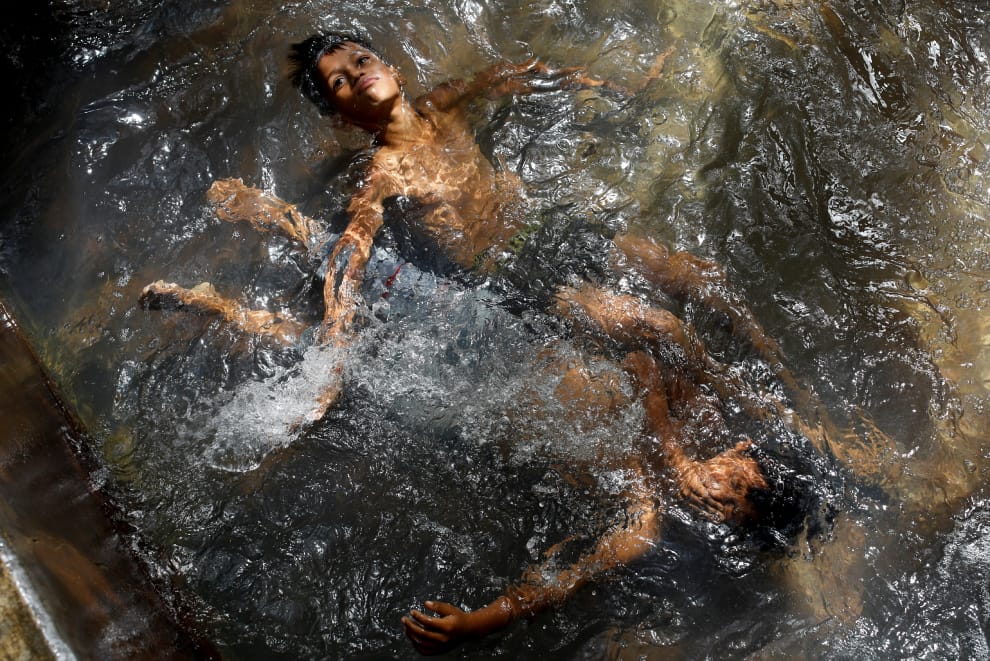 在首都新德里(New Delhi),兩名男孩正泡在水井裡消暑,躲避過於熱辣的太陽。