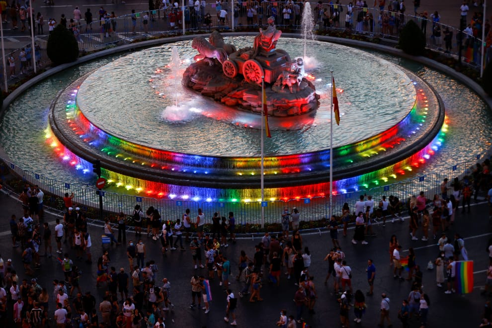 這天是西班牙首都馬德里(Madrid)舉辦同志大遊行的日子。畫面中,該城市的知名地標西伯利噴泉(Cibeles fountain)外圍被投射了美麗的彩虹燈光,而在它的四周,都是來參加遊行的熱情民眾。