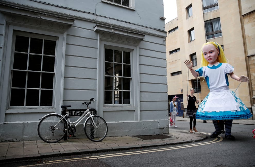 在牛津(Oxford),為了慶祝英國作家路易斯·卡羅(Lewis Carroll)的作品《愛麗絲鏡中奇遇》(Through the Looking-Glass)——也就是《愛麗絲夢遊仙境》(Alice's Adventures in Wonderland)的續作出版 150周年,巨大的愛麗絲木偶正搖搖擺擺地在街頭遊行。