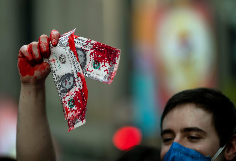 畫面攝於大城聖保羅(Sao Paulo),一名抗議者手上拿著沾上血色顏料的假美鈔,上頭的人物肖像正是波梭奈羅。