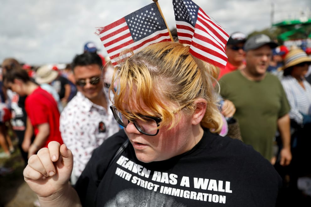 畫面中的女子正是台下的觀眾之一,她的頭上插著兩支美國國旗,上身的衣服則寫著「天堂有道牆,以及嚴格的移民法規」。