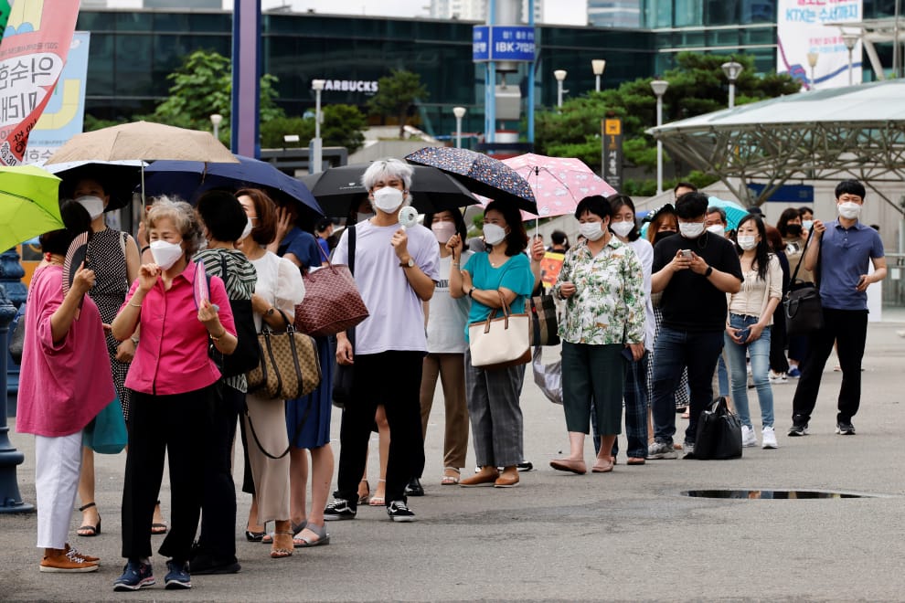 在首爾,一間火車站外頭設立了臨時的COVID-19篩檢站,大批民眾正排隊等候篩檢。南韓疫情於近日急速惡化,本周四(8)公布的 1,275確診病例,更是超過了該國去年 12月面臨第三波高峰時,所立下的最高紀錄 1,240例。