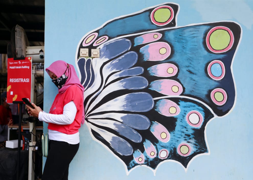 在首都雅加達(Jakarta),一名女子正站在接種站外,排隊等候施打COVID-19疫苗,她剛好靠在一幅蝴蝶的壁畫前,畫面猶如長出一對翅膀。