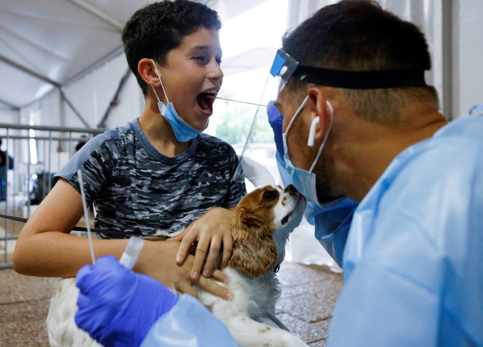 在特拉維夫市(Tel Aviv)拉賓廣場(Rabin Square)的COVID-19臨時篩檢站,一名醫護人員正在幫一位抱著狗狗的小男孩進行快篩。