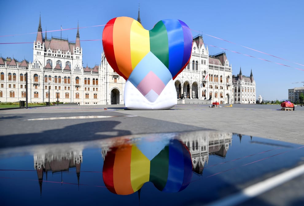 在首都布達佩斯(Budapest)的議會大廈前,國際特赦組織(Amnesty International)和匈牙利LGBTQ+非政府組織「Hatter」一起設置了一個巨大的彩虹愛心氣球,抗議政府的反同及反跨性別政策。