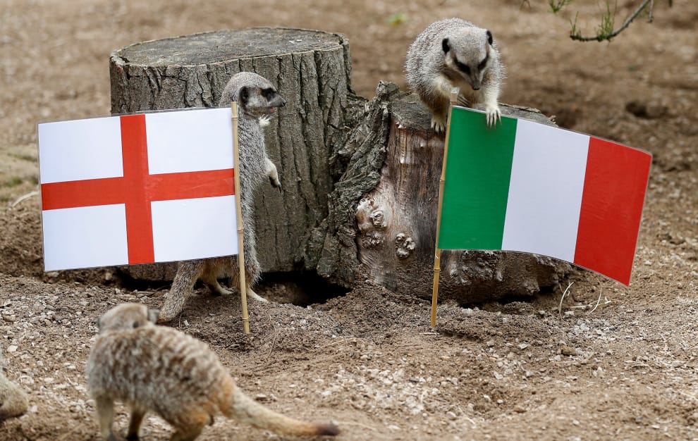 在倫敦的動物園「ZSL London Zoo」,園方準備了英格蘭和義大利旗幟,讓狐獴猜猜看誰能在本周日(11)的 2020年歐洲國家盃(UEFA Euro 2020)中誰會奪得冠軍。