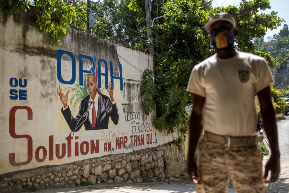 在海地總統摩依士(Jovenel Moise)遭暗殺後,警方在他的家門口派遣了不少警察戒備,其中一人的身後就是一面繪有摩依士塗鴉的牆。