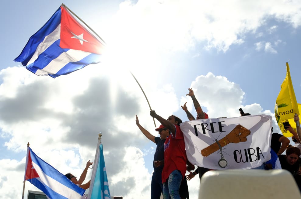 在佛羅里達州邁阿密的小古巴區,來自古巴的移民揮舞著古巴國旗,響應古巴民眾發起的反政府活動,他們要求古巴當局處理越來越嚴重的停電、食物短缺和COVID-19疫情蔓延問題。其中,一名示威民眾手拿寫有「解放古巴」字樣的旗幟。