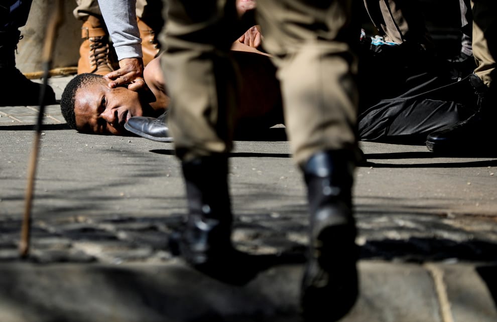 在南非經濟中心約翰尼斯堡(Johannesburg),南非前總統祖瑪(Jacob Zuma)的支持者發起抗議力挺祖瑪的清白,大聲呼喊法官關押祖瑪的判決不公,支持者們引起的騷動也讓當局出動警察鎮壓,其中一名祖瑪的支持者被警察死死壓制在地。