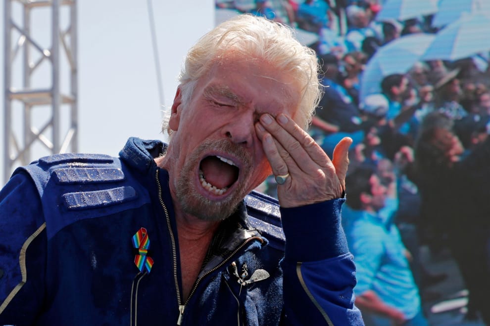 在新墨西哥州的特魯斯或康西崑西斯(Truth or Consequences)美國太空港,今年 70歲的英國億萬富翁布蘭森(Richard Branson)開心慶祝自己成為史上第一位參加太空商業旅行的人員,他在搭乘維珍銀河(Virgin Galactic)火箭公司旗下的飛行器「聯合號」(Unity)前往太空後返回。圖為他在返回地球後開香檳慶祝,卻不慎讓香檳噴到眼睛的畫面。