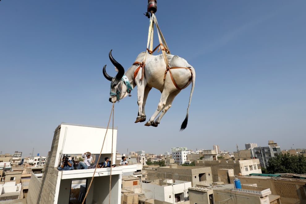 在巴基斯坦第一大城喀拉蚩(Karachi),一頭宰牲節預定要用的牛被吊臂高高吊起,懸在空中。
