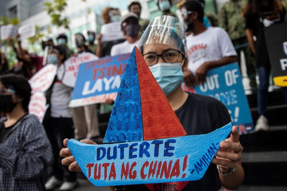 在位於馬卡蒂市(Makati City)的中國領事館外頭,一名運動人士手拿寫著「杜特蒂,中國傀儡」字樣的道具,要求當局對中國硬起來,重申菲律賓對於南海的主權,並且紀念五年前國際法庭的判決。