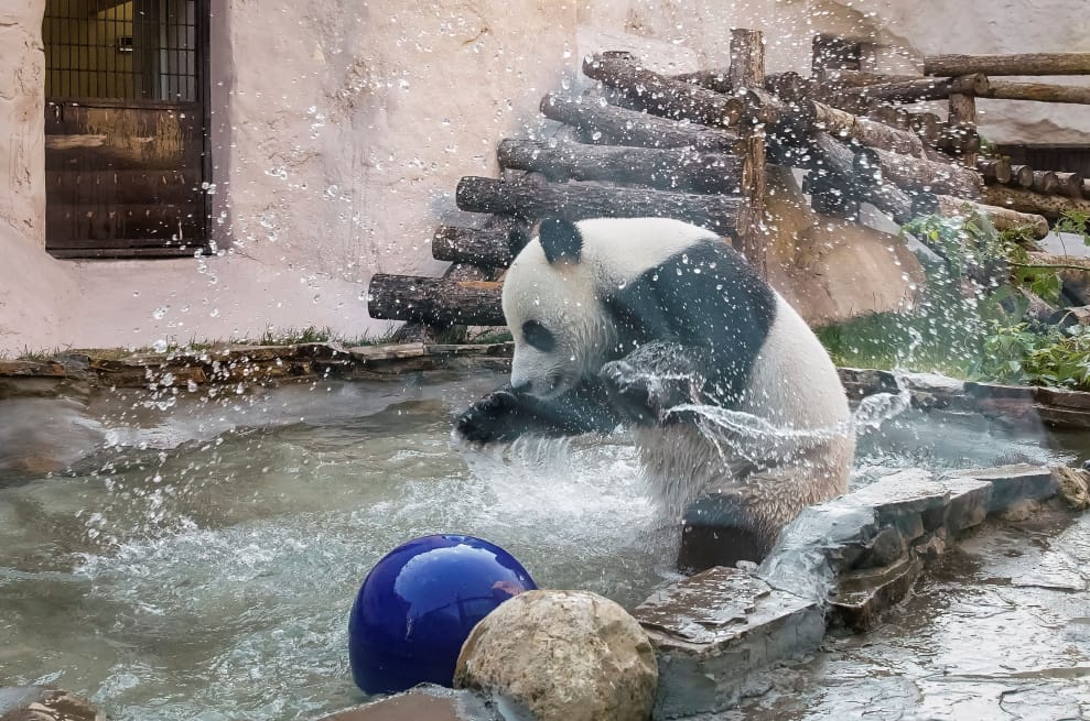 在莫斯科動物園內,一隻貓熊在池子裡玩水消暑。