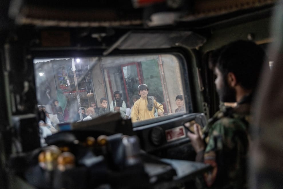 在塔利班組織(Taliban)步步進逼的坎達哈省(Kandahar province),民眾看著駕駛軍車的阿富汗特種部隊經過。