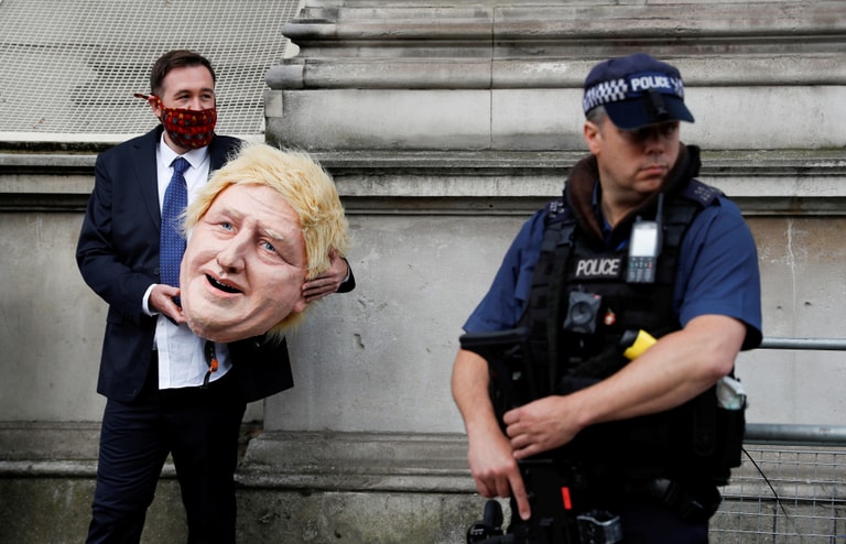 在英國首相府所在地唐寧街(Downing Street),環保團體綠色和平組織的成員打扮成英國首相強生(Boris Johnson)的模樣,站在一旁看著自己的傑作——625公斤的塑膠垃圾,他們特地將這些垃圾運來堆放在唐寧街,藉此譴責英國每三十秒就將 625公斤的塑膠垃圾運往海外堆放。